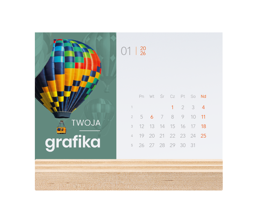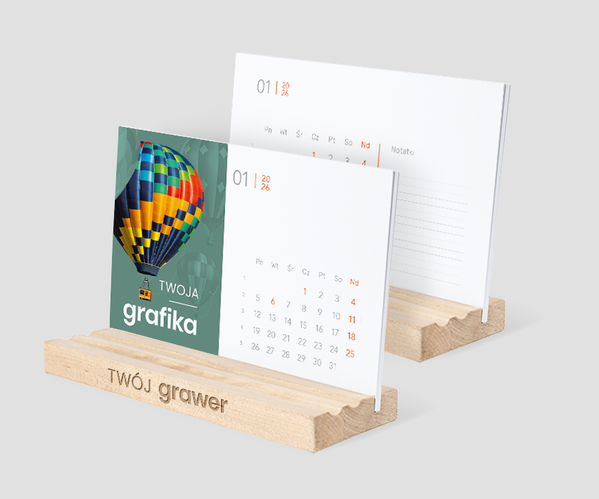 Charakterystyka: 12 pojedynczych kart z kalendarium wydrukowanych jednostronnie cyfrowo, istnieje możliwość wydruku karty dodatkowej pełniącej funkcję okładki. Możliwość dostosowania plansz z kalendarium do indywidualnych potrzeb Klienta (czcionka, kolory, grafika, zdjęcie itp.). Podstawka wykonana z drewna brzozowego z możliwością znakowania grawerem laserowym.